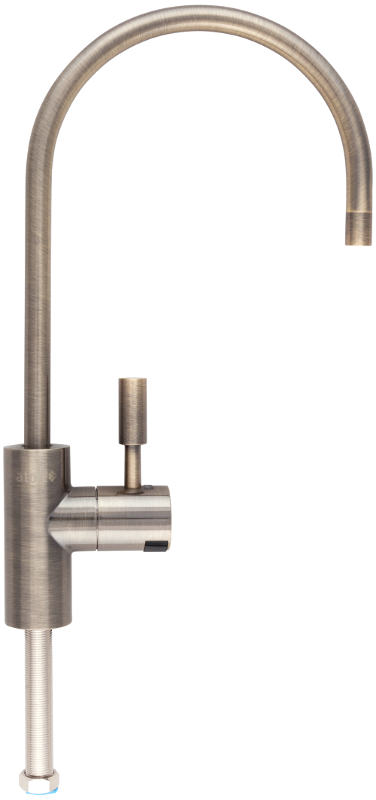 При первичном открытии крана с чистой питьевой водой светодиод приобретает голубой свет. По прошествии 2 000 часов с момента использования, либо 6 месяцев с момента смены картриджей свет индикатора меняется на красный. Высота общая от столешницы 28 см,а высота до выпускного отверстия 16,5 см. Для герметизации соединения с трубкой 1/4" может поставляться с блоком уплотнения, либо быстроразъёмным коннектором. Рекомендован к применению с системами обратного осмоса Atoll.