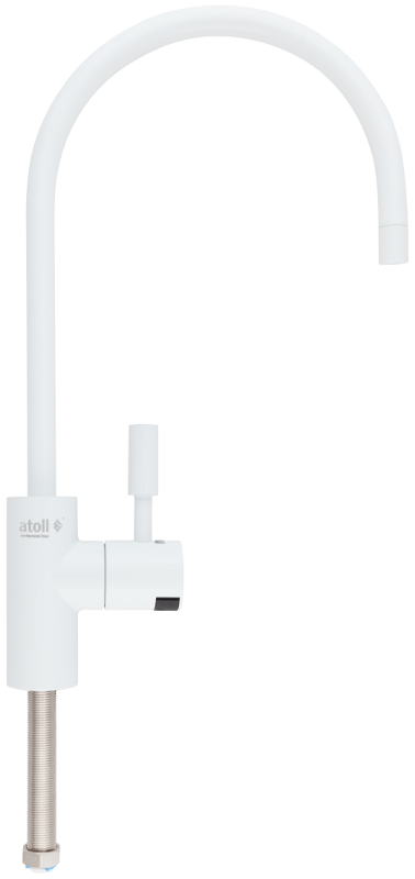 При первичном открытии крана с чистой питьевой водой светодиод приобретает голубой свет. По прошествии 2 000 часов с момента использования, либо 6 месяцев с момента смены картриджей свет индикатора меняется на красный. Высота общая от столешницы 28 см,а высота до выпускного отверстия 16,5 см. Для герметизации соединения с трубкой 1/4" может поставляться с блоком уплотнения, либо быстроразъёмным коннектором. Рекомендован к применению с системами обратного осмоса Atoll.