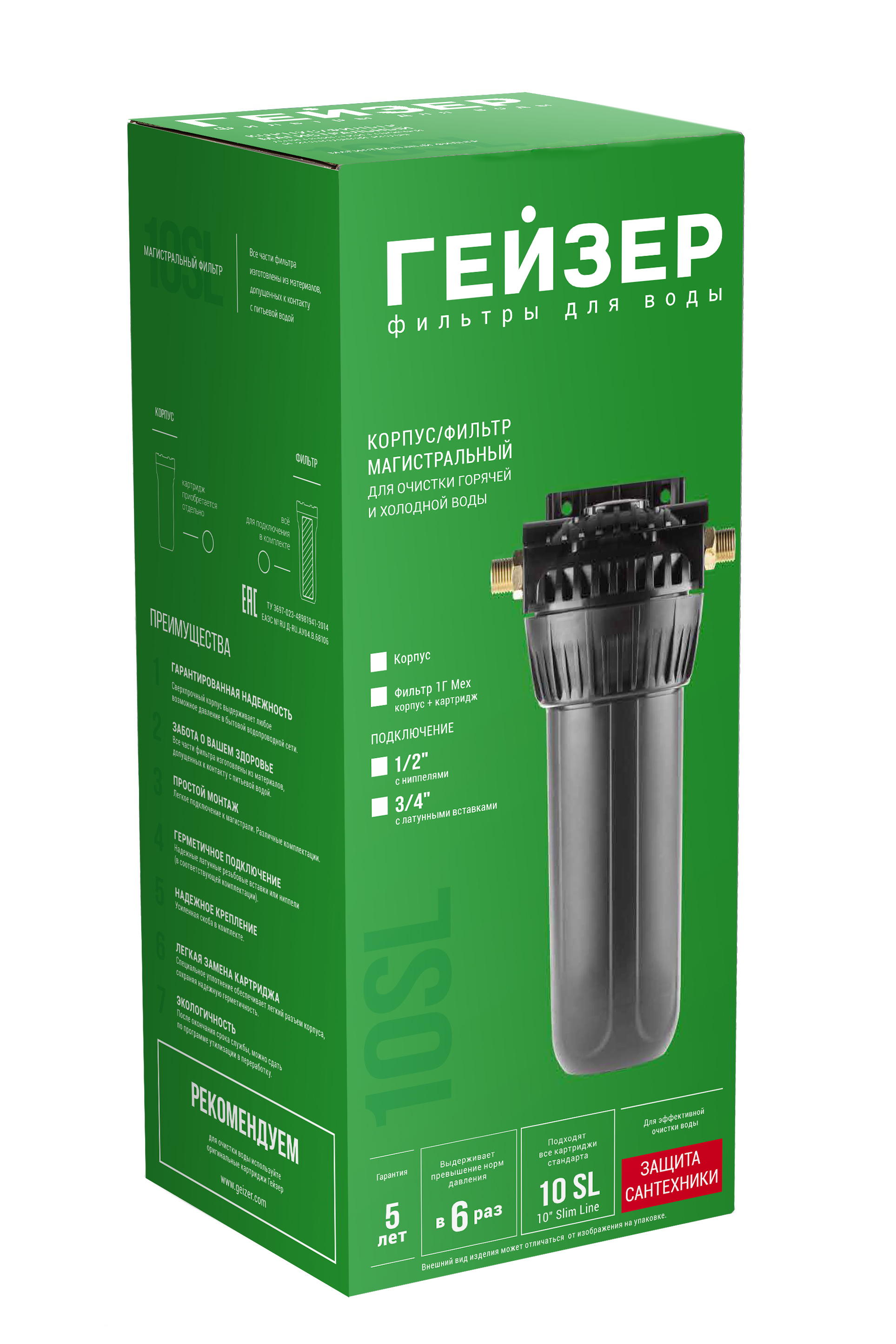 Корпус Гейзер 10SL 1/2" для горячей воды используется с картриджами стандарта Slim Line 10". Максимальное рабочее давление 7 атм. Максимальная рабочая температура 90°С. Присоединительный размер 1/2". Гарантия 5 лет. Производство Россия. В комплект входит ключ для замены картриджей. Изготовлен из термостойкого полиамида с металлическими ниппелями. Корпус рассчитан на работу под давлением и установку на входе в систему горячего или холодного водоснабжения. Комплектуется пластиковой скобой. В производстве корпусов используются материалы пищевого класса.