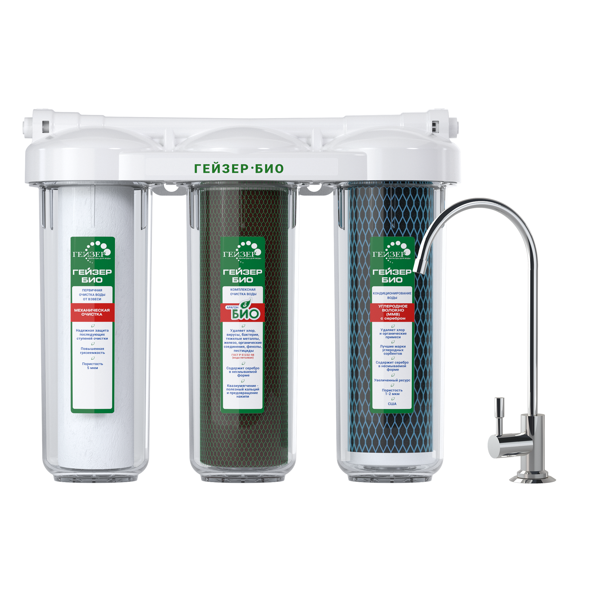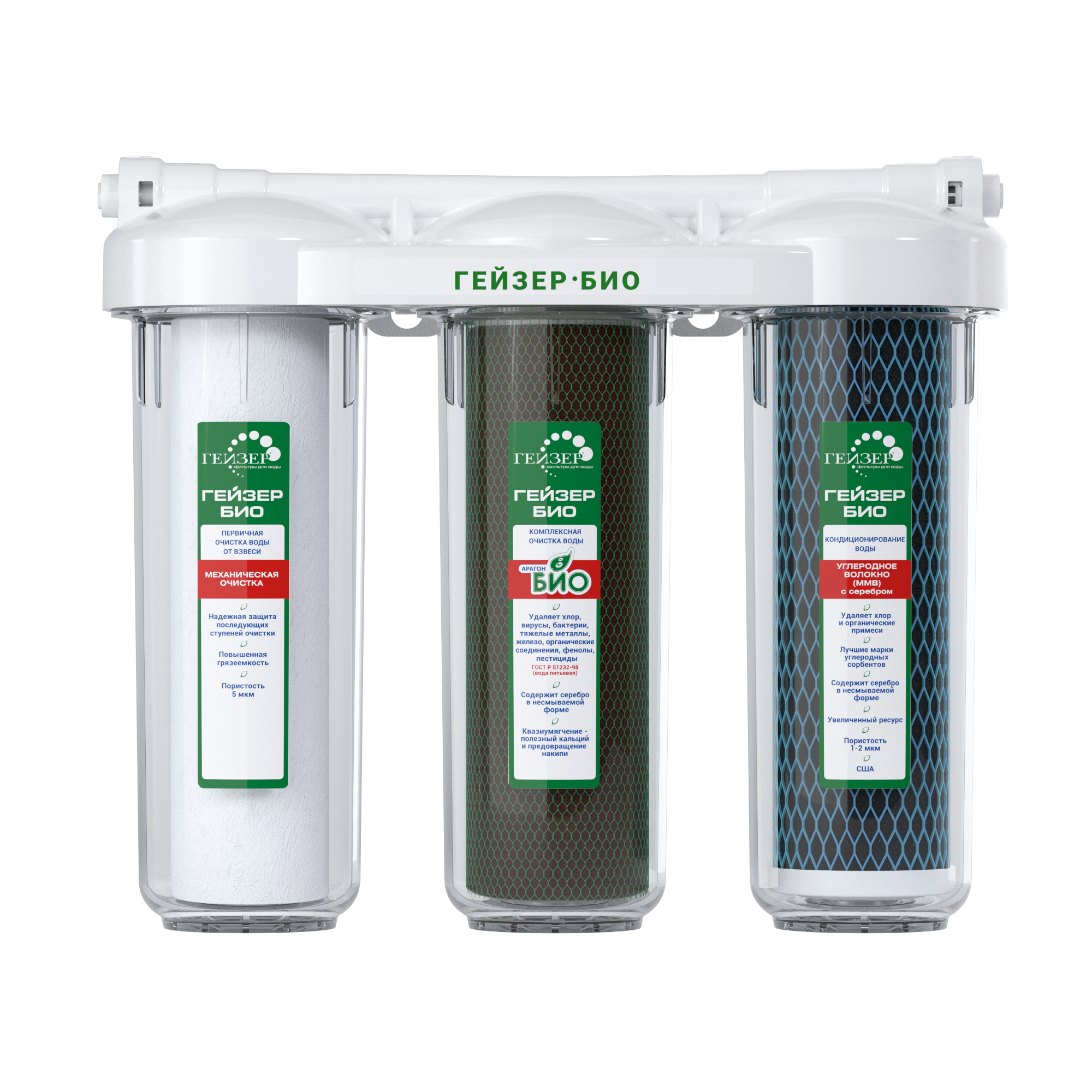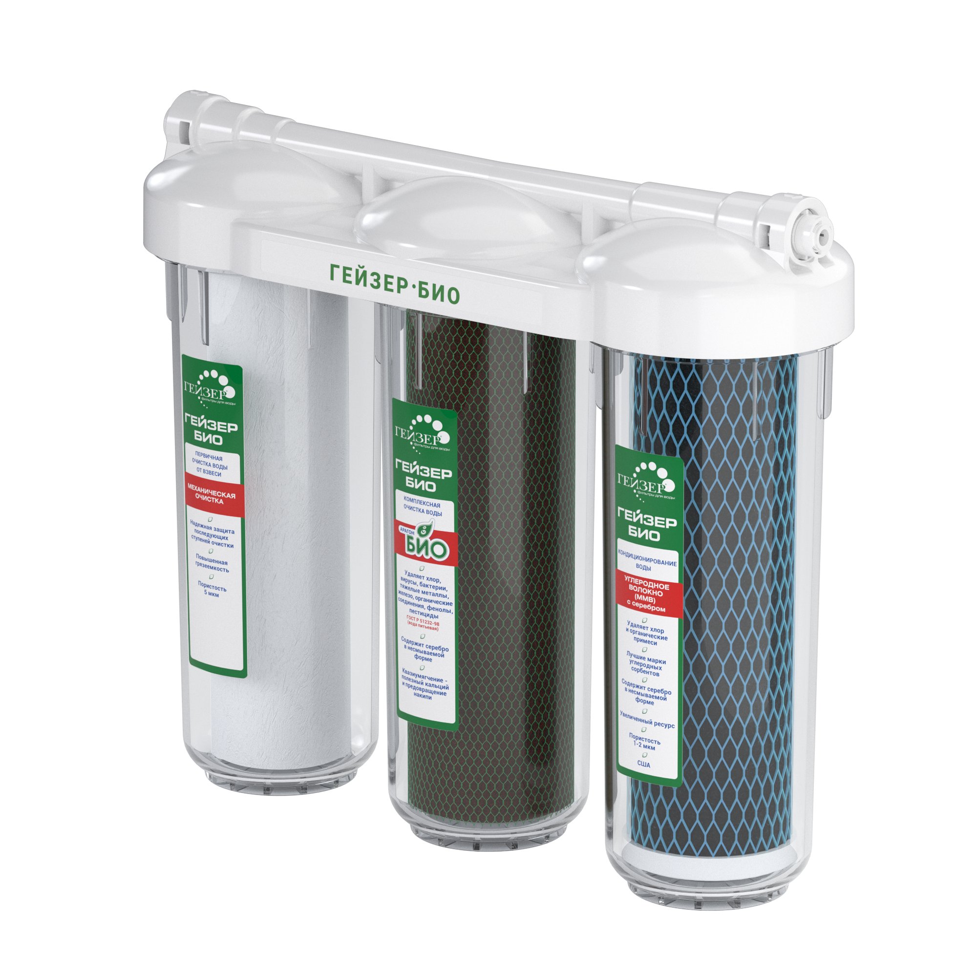 - Картридж из уникального по составу материала Арагон Био, обеспечивает комплексную очистку воды.- Дополнительный картридж служит для предварительной очистки от взвесей, ржавчины, прочих примесей.