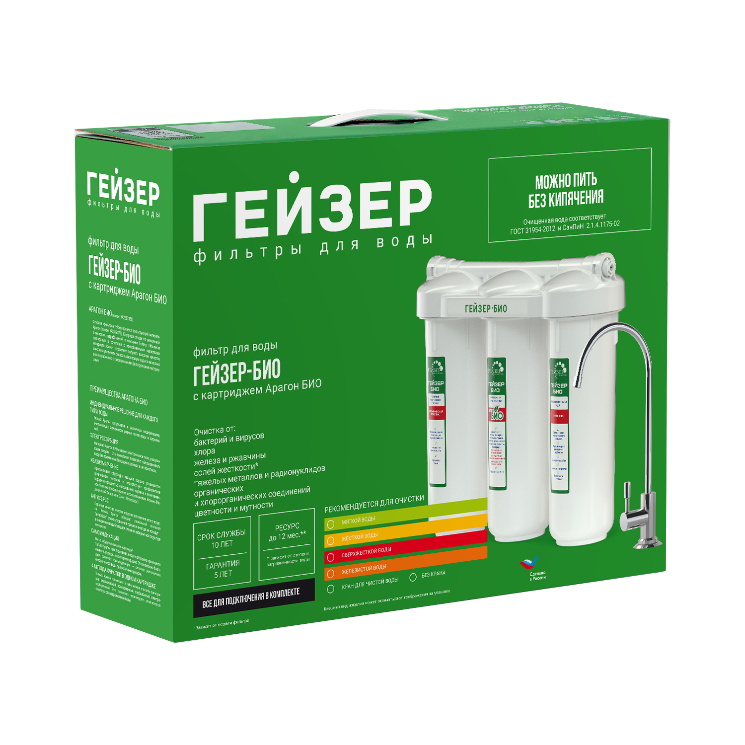 Арагон-М БИО - удаляет растворенное железо, тяжелые металлы, радионуклиды. 100% удаление бактерий и вирусов. Содержит минерализатор B (Ca) - обогащение воды полезным кальцием.