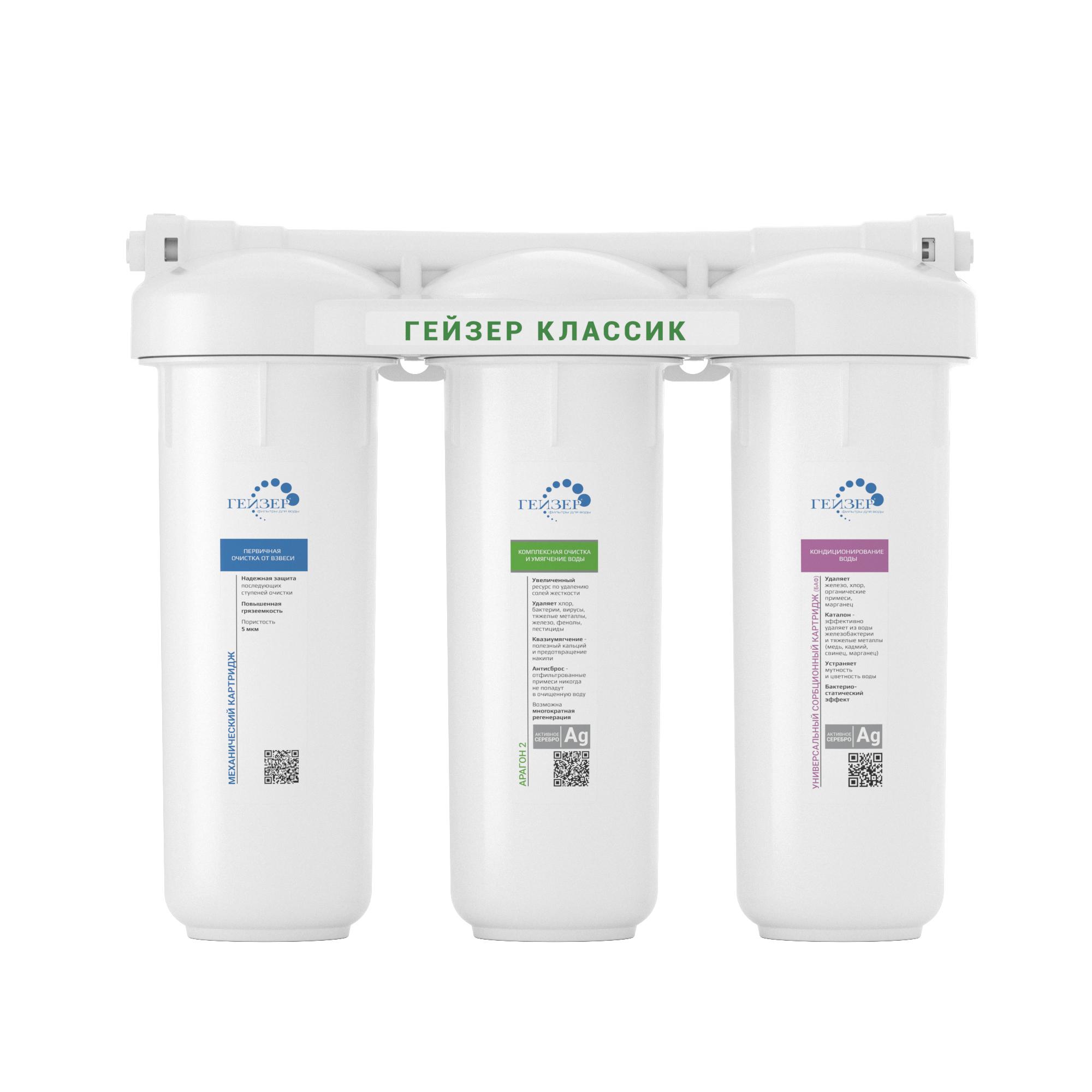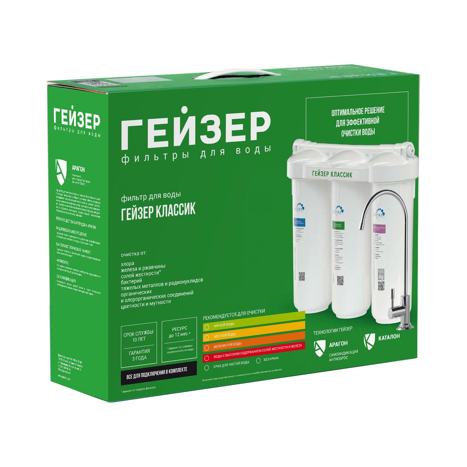 Бытовая система под мойку Гейзер Классик для жесткой воды со средним уровнем минерализации. Скорость фильтрации до 3 л/мин. Рабочее давление от 0,5 атм. Температура воды до 40 °С. Ресурс Арагон 2 7000 л. (с регенерацией до 25 000 л.).<br>