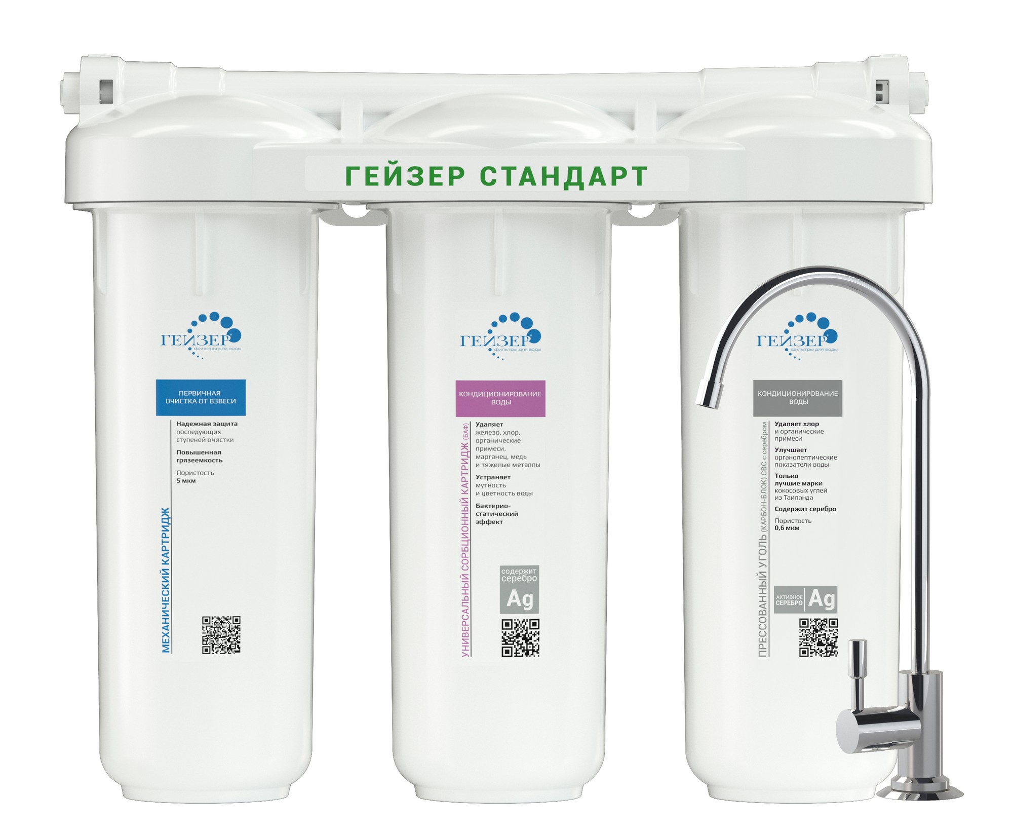 Фильтр Гейзер Стандарт для жесткой воды состоит из 3 картриджей: