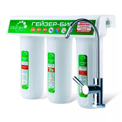 Бытовая система под мойку Гейзер Ультра Био 441 для железистой воды. Скорость фильтрации до 3 л/мин. Рабочее давление от 0,5 атм. Температура воды до 40 °С. Ресурс БА-10SL до 2000л., Арагон Ж БИО до 7000л. Дисраптор до 10000 л.<br>
