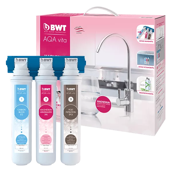 Фильтр для воды BWT AQA VITA предназначен для очистки водопроводной воды от механических примесей, хлора, хлорорганических соединений и ионов тяжелых металлов с последующим обогащением ионами магния. 3 ступени очистки: картридж Carbon Block (C) удаляет механические примеси, хлор, органические соединения, тяжелые металлы; Post Filtration (PO) удаляет остатки механических примесей, Magnesium Mineralaizer (M) минерализирует воду.