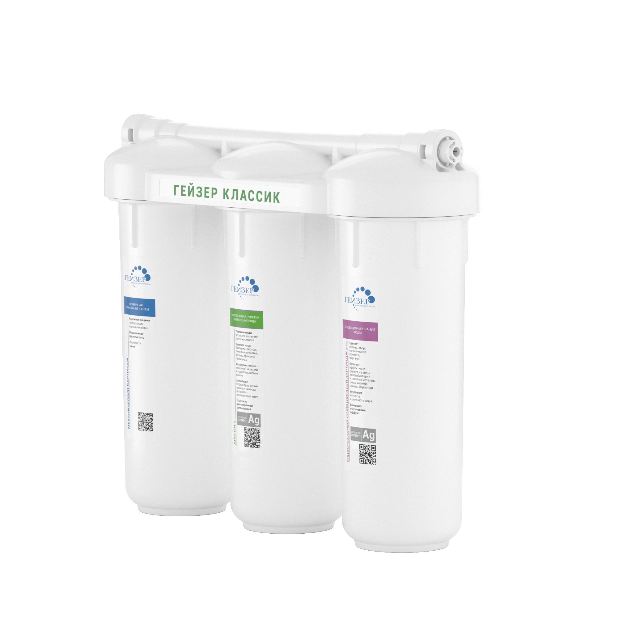 Трехступенчатый Гейзер-Классик для жесткой воды представляет собой небольшое устройство с классической системой фильтрации воды с помощью картриджа Арагон и нового картриджа БАФ,с повышенным ресурсом по удалению тяжелых металлов, железа, хлора и органических примесей. Имеет достаточно небольшой, компактный размер.<br>