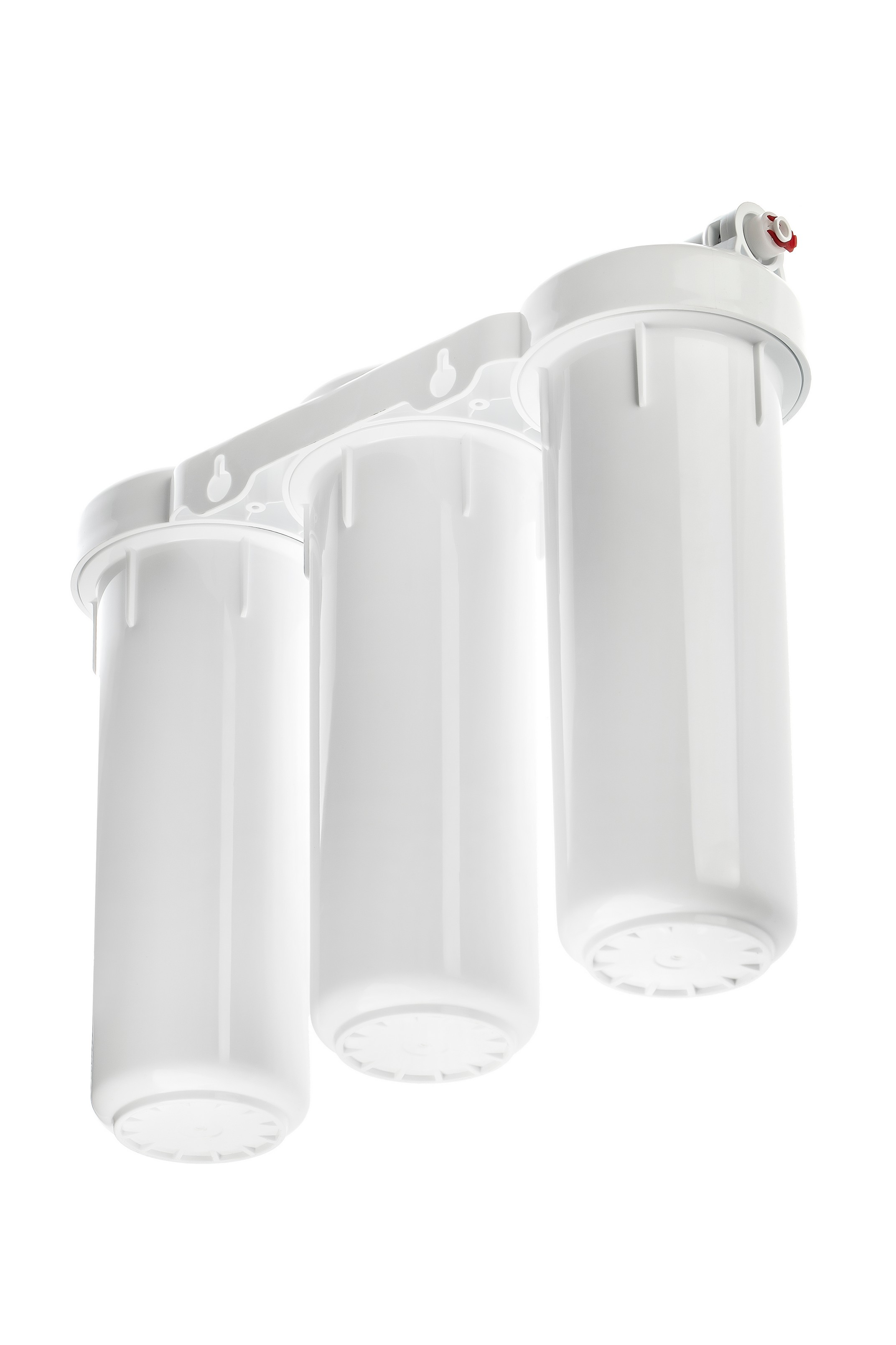 Фильтр включает в себя: полипропиленовый модуль PP, 10"SLIM - для удаления нерастворимых частиц (песок, взвесь, ржавчина); Карбон блок CBC 10" SLIM, благодаря которому из воды удаляется хлор, фенол, органические и хлорорганические соединения, а также неприятный вкус и запах; сорбционный картридж (БАФ) - на данной стадии удаляется не только хлор и органические примеси, но и снижает содержание железа и тяжелых металлов.<br>
