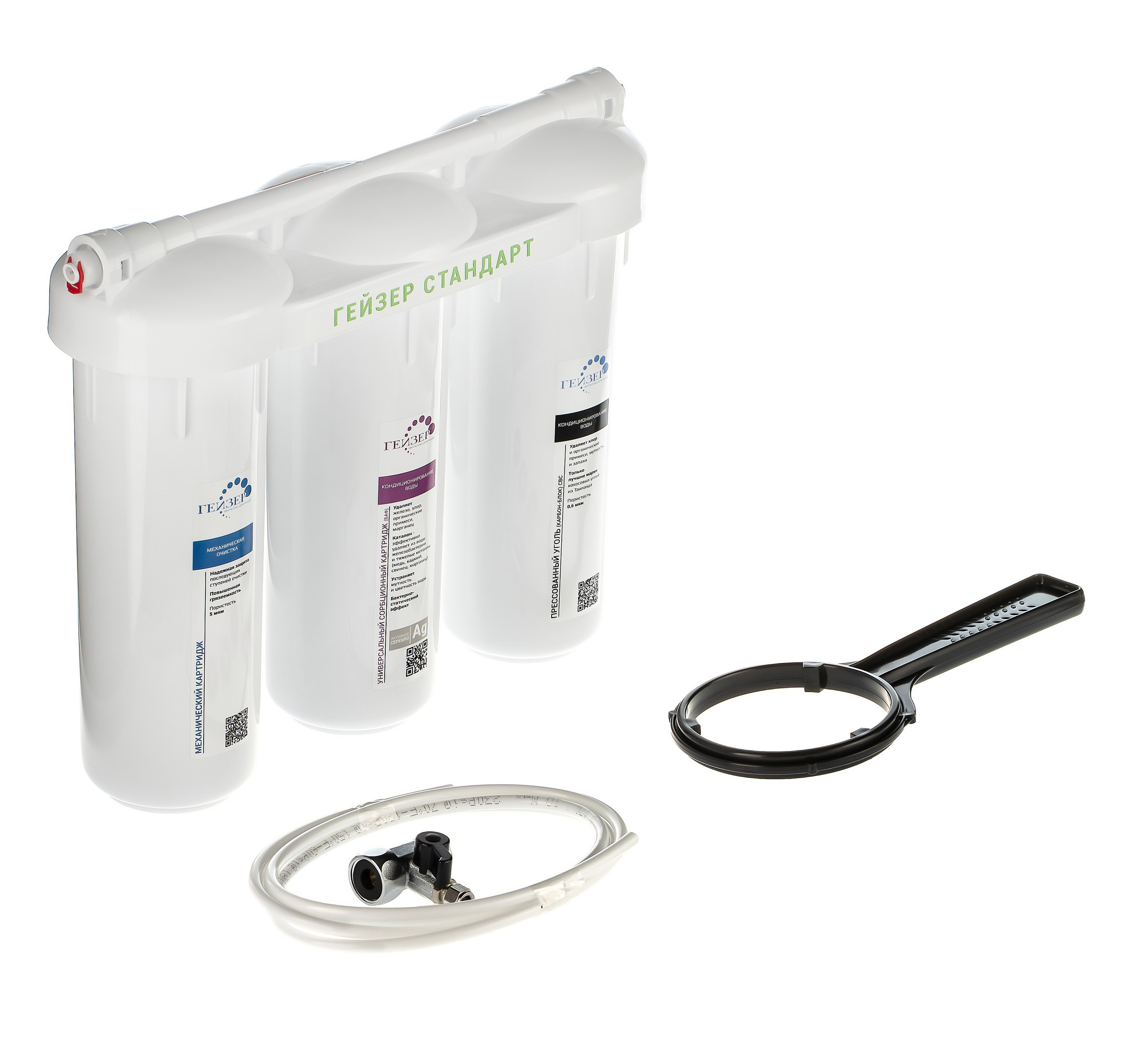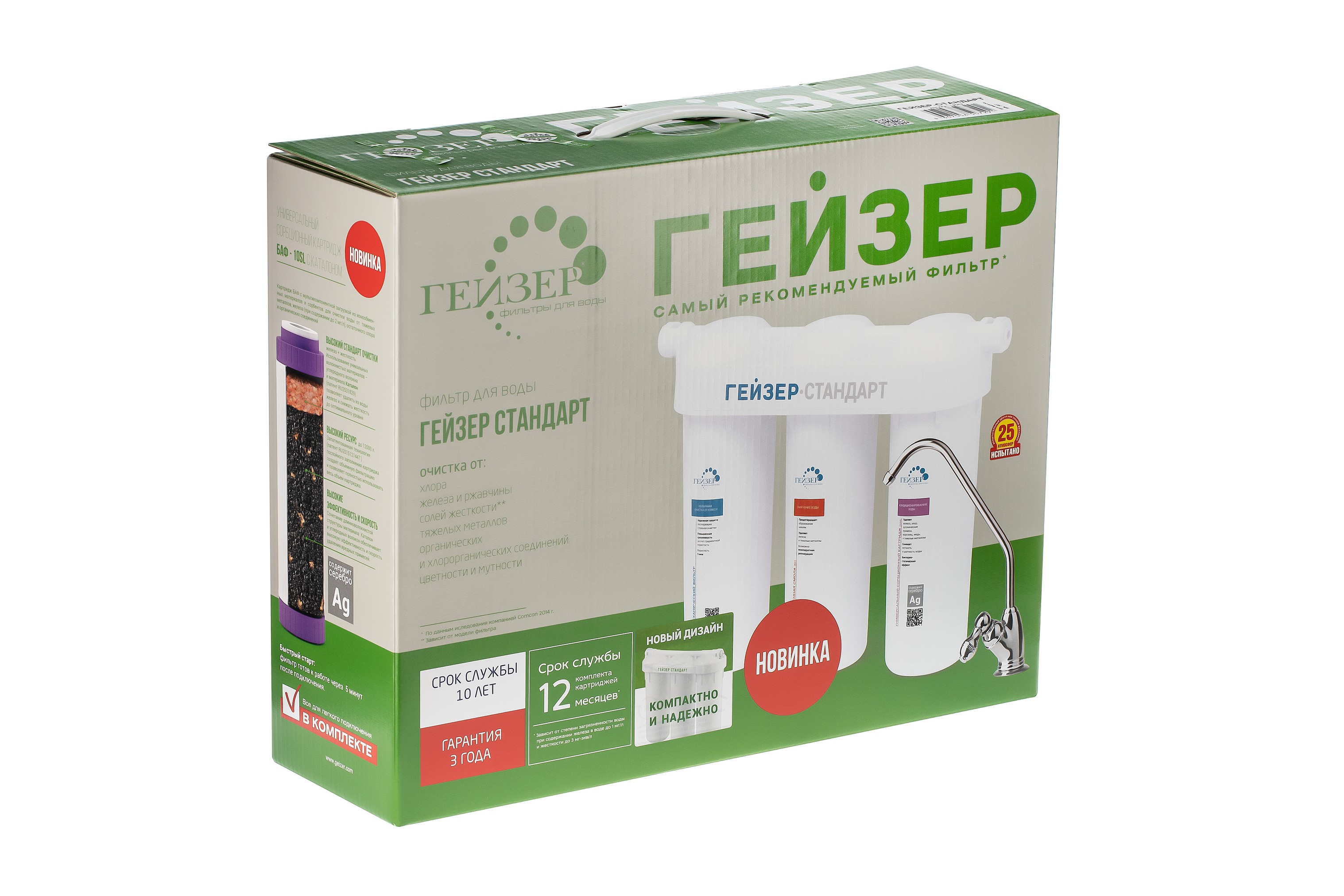Фильтр для воды Гейзер Стандарт предназначен для очистки мягкой водопроводной воды. Фильтр способен удалить из воды излишки взвешенных частиц, мутности, цветности, хлора, тяжелых металлов, органических соединений и др. примесей.<br>