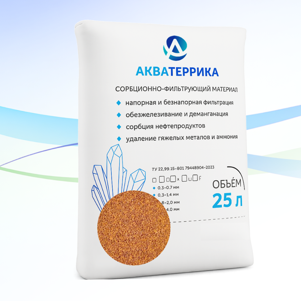 Сорбент минеральный АКВАТЕРРИКА D предназначен для очистки поверхностных и скважинных вод. Его применяют в системах напорной и безнапорной фильтрации. Он удаляет механические взвеси, железо, марганец, алюминий, снижает цветность и улучшает органолептические показатели воды. Сорбент представляет собой представляет собой гранулированный материал от светло-оранжевого до красно-коричневого цвета. Допускается применение в диапазоне рН от 2 до 10. Он не подкисляет и не подщелачивает воду. Каталитические свойства сорбента АКВАТЕРРИКИ наиболее эффективно проявляются при рН выше 6,5.
