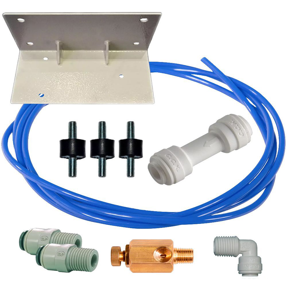 Монтажный комплект предназначен для монтажа компрессора LР12 в бытовых и промышленных системах очистки и аэрации воды. В монтажный комплект к компрессору входят: кронштейн для крепления; крепеж, подавляющий вибрацию; фильтр-глушитель, регулятор воздушного потока, прямой адаптер, трубка, обратный клапан, уголок, переходник. Вес 1,5 кг.<br>