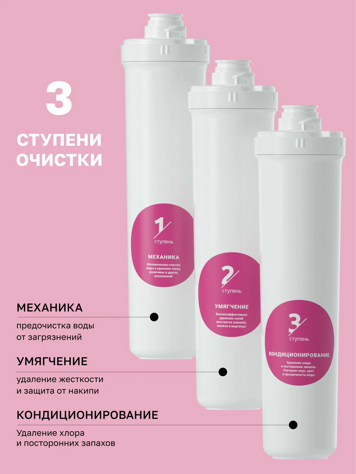 - Картридж для умягчения. Он избавит от растворенных загрязнений, устранит соли жесткости, растворенное железо, марганец.