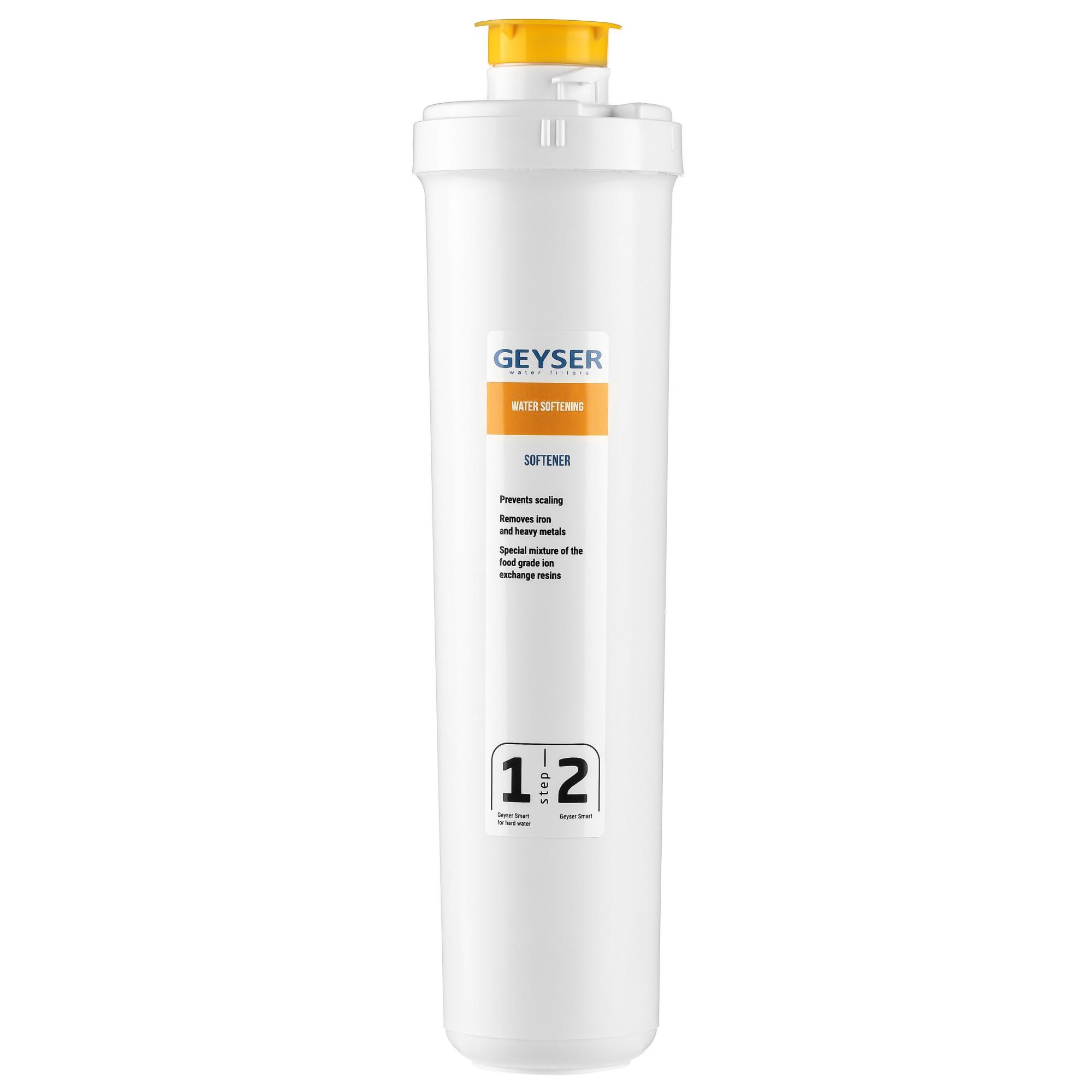 Картридж Гейзер Умягчение предназначен для нейтрализации избыточных солей жесткости, тяжелых металлов и железа из воды. Предотвращает появление накипи и ржавчины. Картридж используется в качестве первой ступени очистки воды в бытовых системах серии Смарт. Он имеет следующие характеристики: производительность 1,2 м³/час, рабочая температура 4-40°C, ресурс 10000л, порядок установки - первая ступень очистки, Материал корпуса пластик. Производство Россия. Фильтрующий материал картриджа - специальная смесь ионообменных смол пищевого класса. Картридж снабжен технологией Quicklock, что позволяет заменять его одним движением руки. А также имеет функцию самоиндикации окончания ресурса - резкое уменьшение напора чистой воды. <br>