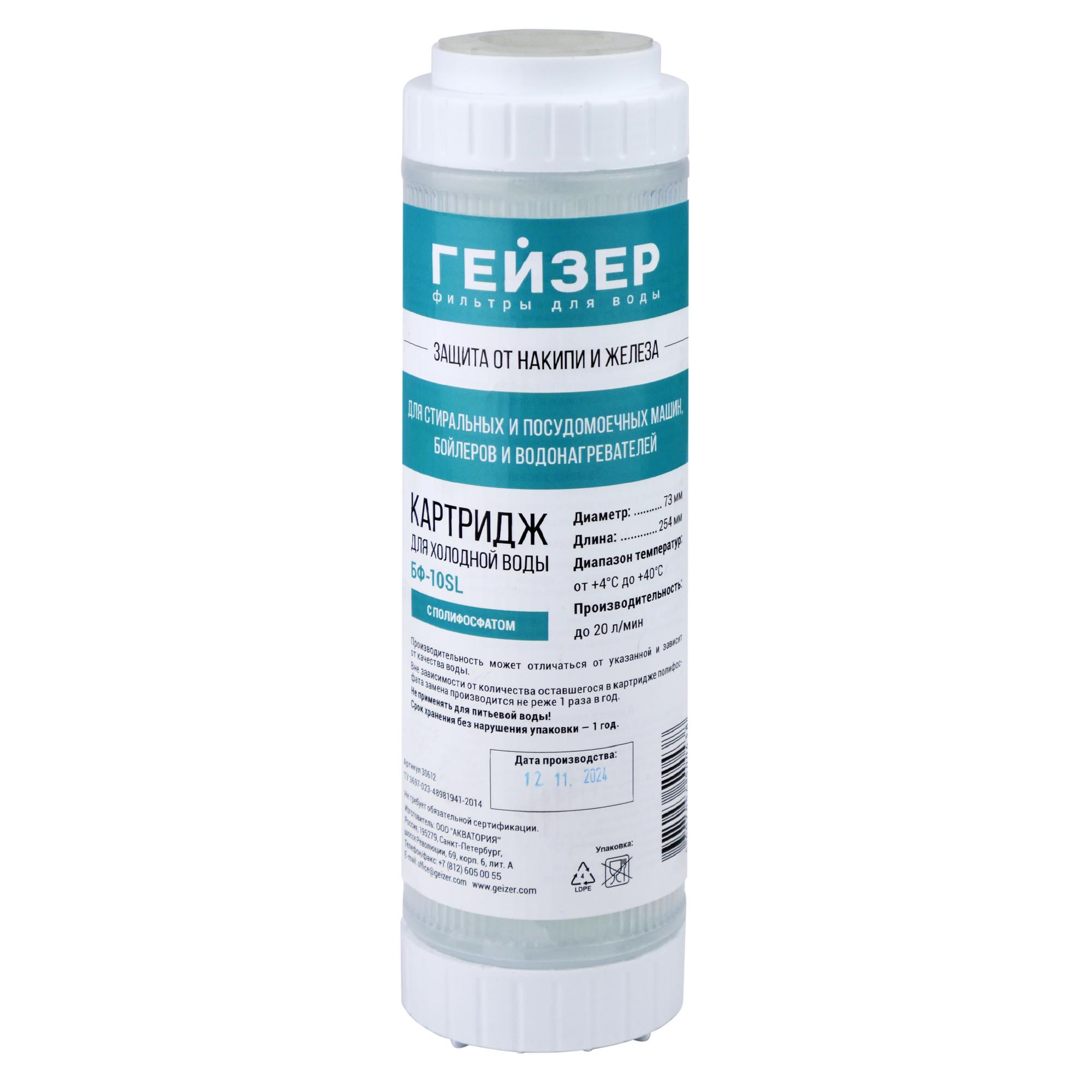 Картридж БФ с засыпкой из полифосфата для технических нужд, предотвращает образование накипи на нагревательных элементах. Температура очищаемой воды 4-35°С. Типоразмер SL10". Ресурс картриджа зависит от степени жесткости воды. Кристаллический полифосфат, используемый в картридже БФ, применяется для связывания солей жесткости и растворимого железа, для водезащиты нагревательных элементов стиральных, посудомоечных машин и водонагревателей от накипи. По мере использования полифосфат медленно растворяется в воде. При растворении полифосфата более, чем на половину необходимо произвести замену сменной засыпки. Воду после картриджа БФ можно использовать в технических целях: мыть посуду, стирать белье, принимать душ. Нельзя использовать в качестве питьевой воды.<br>